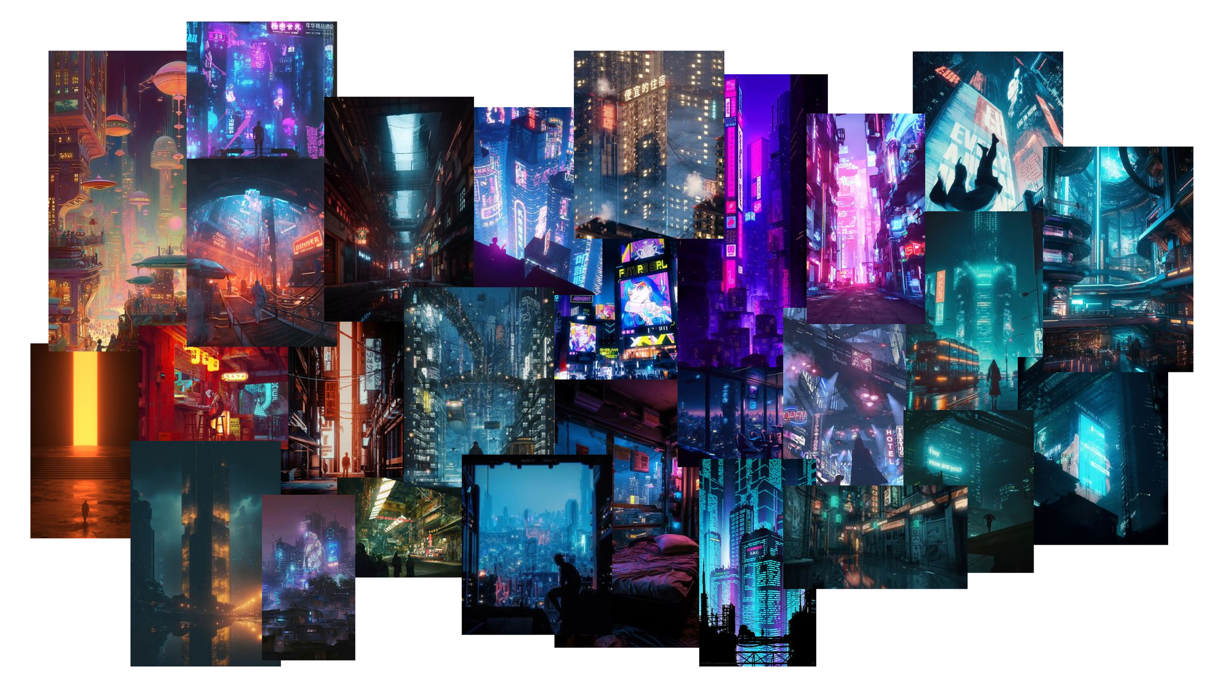 Heavily ties with theme of Cyberpunk 2077, Metropolis (1927) or The Matrix Resurrection (2021), having neon lights and signs, holographic billboards scattering to every possible corner of the city; towering skyscrapers and intricate, dusty rusty, futuristic textures are a must.